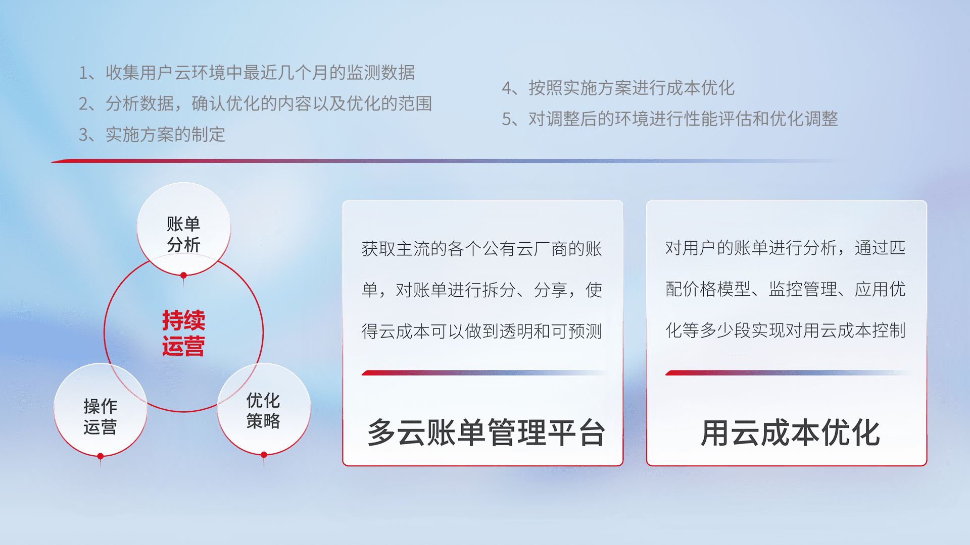 通过多云纳管,,,以统一的资源数据模型把客户的云资源进行抽象和封装,,,,进而实现对多云资源的统一操作,,,,保障云资源管理的可靠性、、稳定性与可用性。。。。量身定制化运维内容,,,,配置、、、、开发运维、、、、补丁管理、、、、备份、、监控、、、、认证和访问管理、、、审计和日常巡检等,,,,保障在用云过程中的可靠度,,稳定度以及高可用率。。